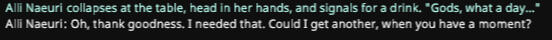 I prefer to work in 2-3 textbox posts. I try to type quickly and have a response ready in between 5 to 10 minutes (although significantly faster for conversational RP), and keep the scene moving. I really enjoy being able to "yes-and" my partner - as long as your posts help move a scene forward or you're able to communicate where you want a scene to go, I'm happy to operate within those bounds - and communicating what the goals of a scene beforehand are will really help us do that together as well.In 1:1 scenes, stylistically, I prefer to use /em for actions (narrated third-person), and /s for dedicated dialog lines. I'll use /p or tells for OOC check-ins, if necessary. In practice, this might look like: